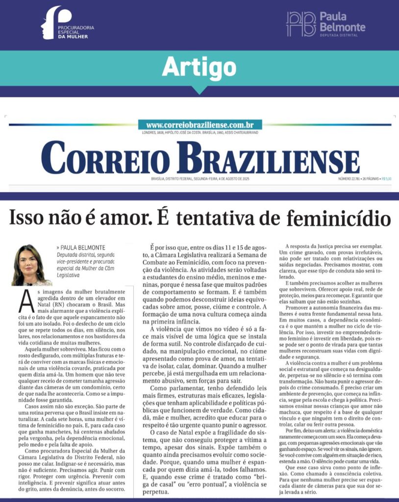 Como Procuradora Especial da Mulher da Câmara Legislativa do Distrito Federal, não posso me calar. Indignar-se é necessário, mas não é suficiente. Precisamos agir. Punir com rigor. Proteger com urgência. Prevenir com inteligência. E prevenir significa atuar antes do grito, antes da denúncia, antes do socorro.