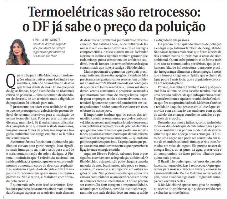 Por Paula Belmonte – Deputada Distrital, segunda vice-presidente da Câmara Legislativa e presidente da Comissão Parlamentar de Inquérito (CPI) do Rio Melchior